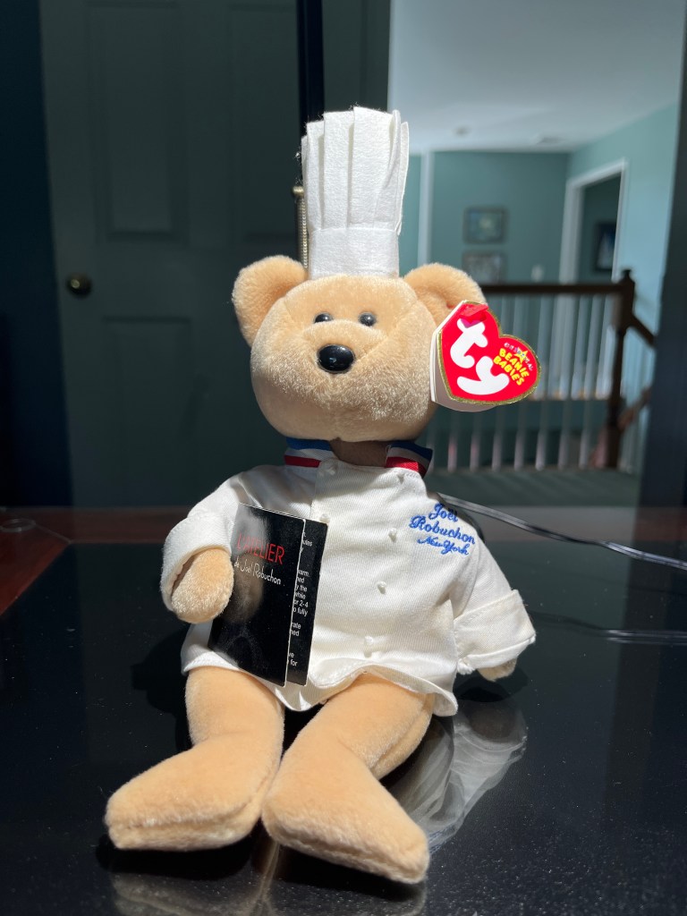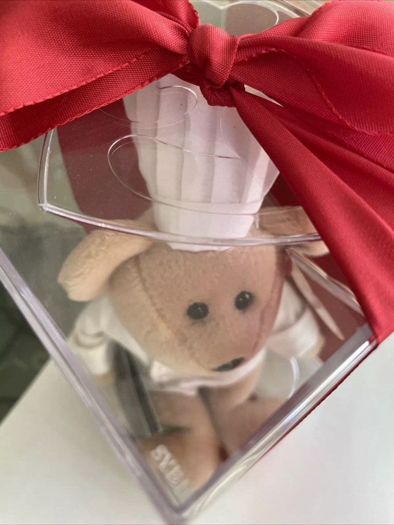 Most collectors are more than happy with a chef bear on its own. To many, securing a chef bear is THE ULTIMATE goal in beanie land. But there are “complete” examples that have the original red invite placard/original box and ribbon. Finding these invitation bears with all pieces intact is extraordinarily difficult. Below are pictures of one the NYC invitation bears with all pieces intact (lace ribbon and red placard card with details), two examples of the non NYC event invitation teddy (with darker opaque ribbon + partial red placard card) and a solo bear that likely served as table decoration at the event.