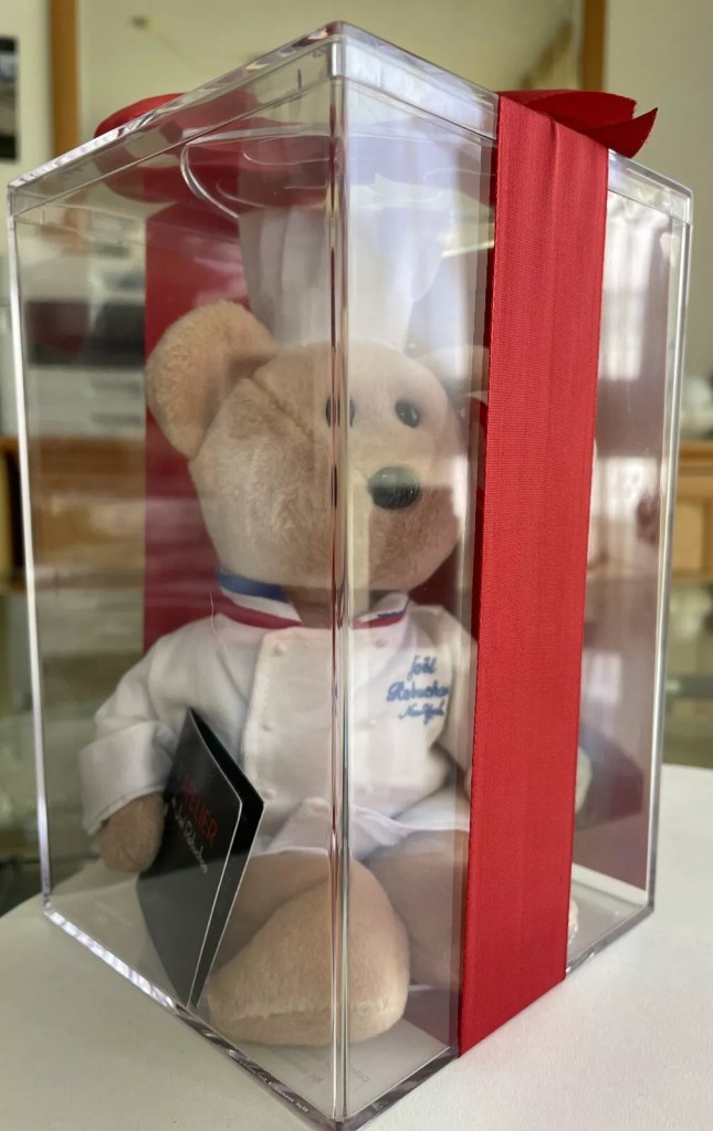 Other sites have outlined the general history of this piece, but we go a few steps further here. The quick underlining recap: Ty Warner, owner of the Four Seasons New York, hired famed Michelin Star chef Joel Robuchon to be his executive head chef at the L’Atelier de Joël Robuchon – the premier restaurant in the hotel. The restaurant was set to open on September 5th, 2006. Mr. Warner invited select food critics, journalists, and other guests/prominent foodies in NYC to attend dinner on one of three evenings (Sept 18, 19, or 20th, 2006). Particular journalists/reporters/food critics/notables were sent this bear.