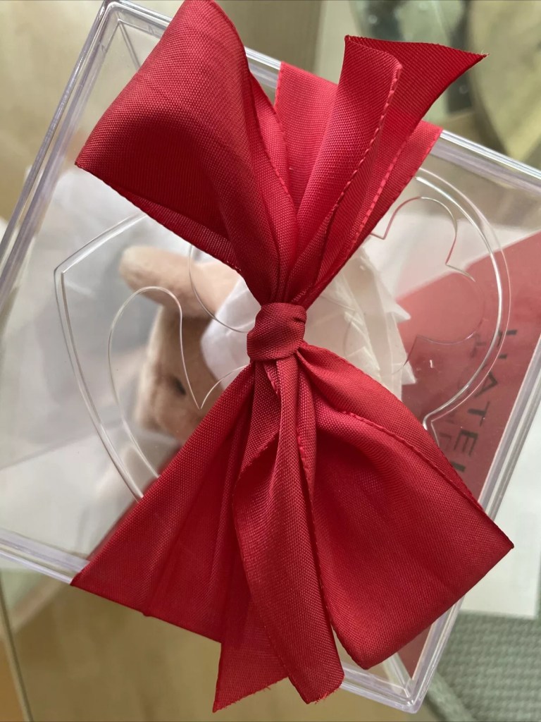 1.) Category #1. An initial wave of bears went out to NYC journalists/foodies/chefs. The bears themselves served as invites for the opening party for the NYC restaurant. These specific bears came with a lace red ribbon in an official Ty box carrying the bear with a red “invite” placard card that on its reverse had party details and dates. Serving effectively also as a save the date. We believe these to be the top tier bears headed to most important publications/most desired attendees in the NYC area who Ty actually hoped might attend in person. Most of these examples have lost their case, ribbon, and red placard.