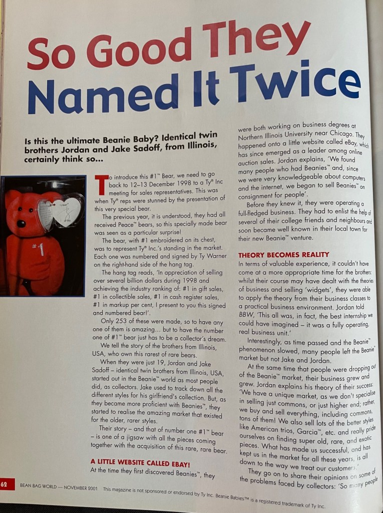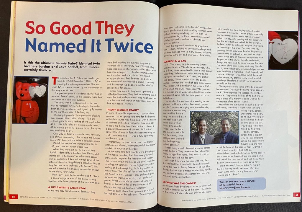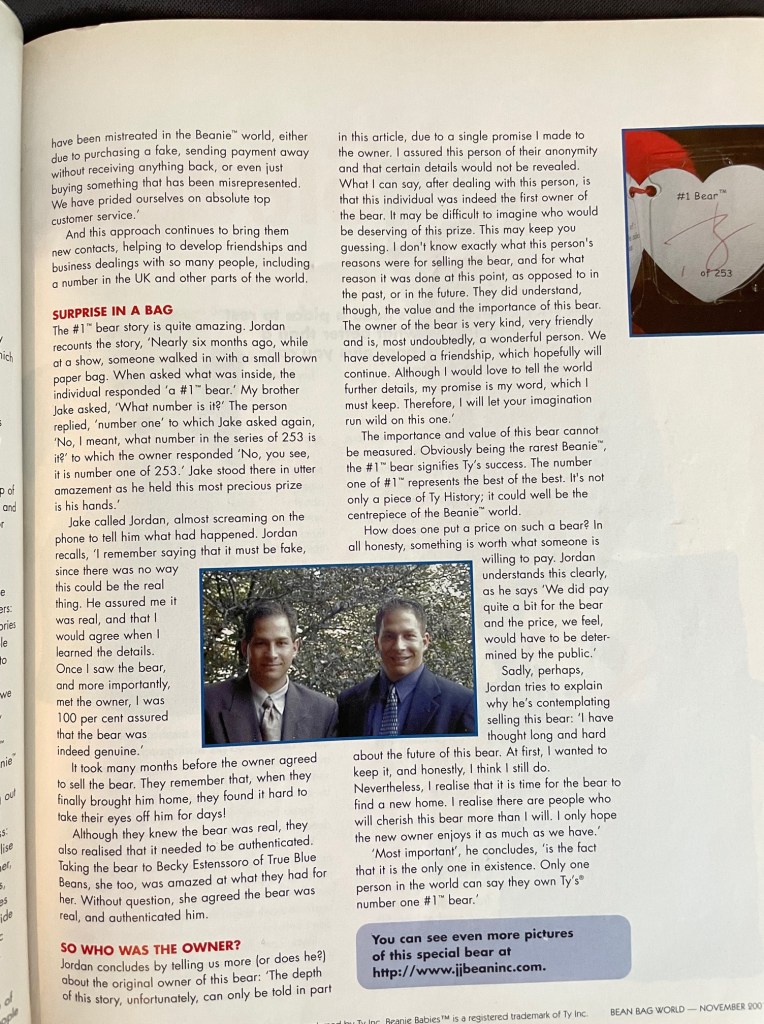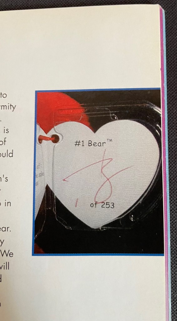 This piece may not actually count as its own novel piece, but it is an absolute legend among the most elite collecting circles. The #1 rep bear was given out to 253 reps at their holiday party back in 1998. It quickly became the most coveted piece, with an example fetching $5,000-$10,000. The lower the number out of 253, the more coveted the piece. It was always rumored that ty kept the #1 example in a series (billionaires, rep bear, coral casino, etc). While we can’t officially confirm or deny this, a few #1 pieces have made it out into the hobby. One such example was in fact the #1 #1 rep bear (#1 of 253). Below please find pictures of this bear and the story of how it came to reach the collecting community. Technically, the piece was owned by Ty’s family. There is something so absolutely intoxicating about this piece. It represents the pinnacle of the beanie baby phenomenon.