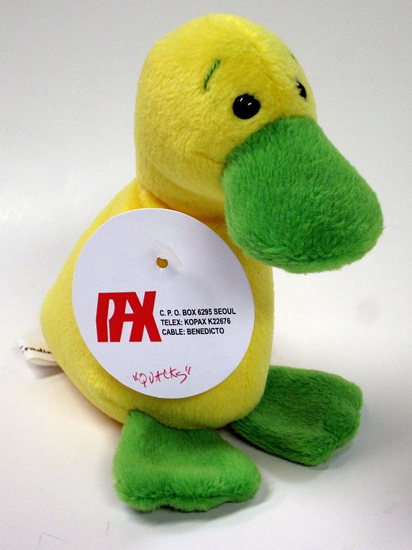 It took many years to locate proof of existence for a true prototype wingless quackers. This example has a speedy green bill, feet, and eyebrows! The piece also comes complete with pax hang (dated 1993) and pax tush tag. We also have a note from Ty on front pax tag “Quacks”. It is possible he was highly considering this to be the original name for quackers. We have seen Ty make other such notes on early prototypes as he tried to hone in on a name he liked. Wingless Quackers was released in June of 1994 (mid 1994 releases) with remaining wave of 1st generation tagged pieces outside of the original 9!.