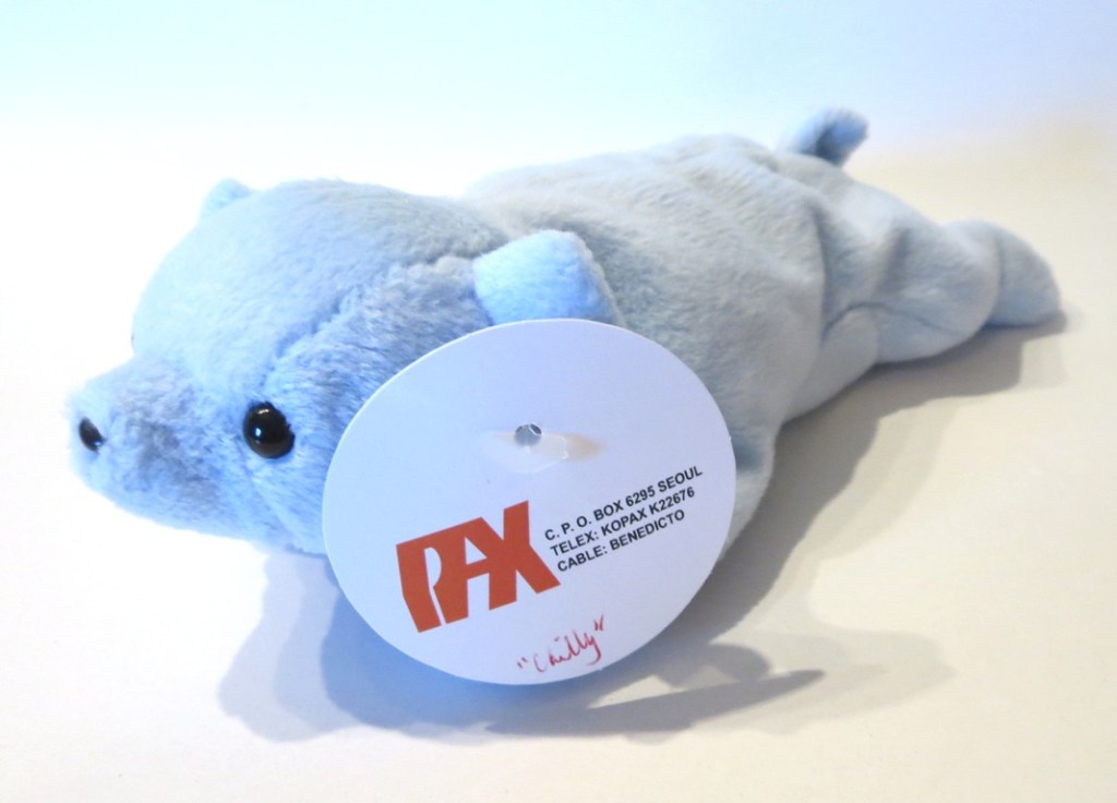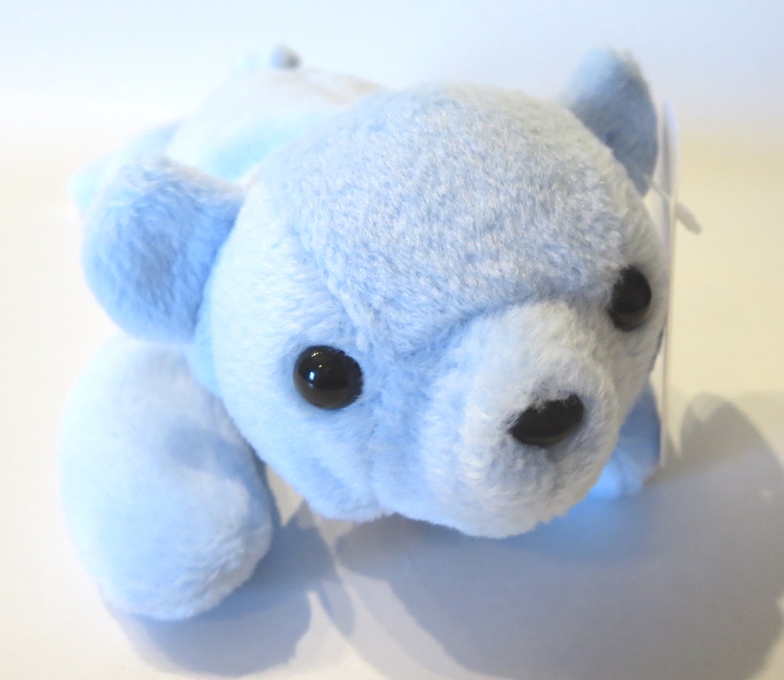 An original Chilly the polar bear in LIGHT BLUE! This is a full color departure for one of the most coveted 1st generation styles! There are so many incredible tidbits to this piece. First, 1992 pax tags – puts this in the earliest wave for this style. Next, the piece is completely light blue – the same fabric as the light blue peanut. The piece is complete with pax tush tag and pax hang tag, but if you look closely, the hang tag has a note scribbled by Ty denoting the piece’s eventual name “Chilly”!!