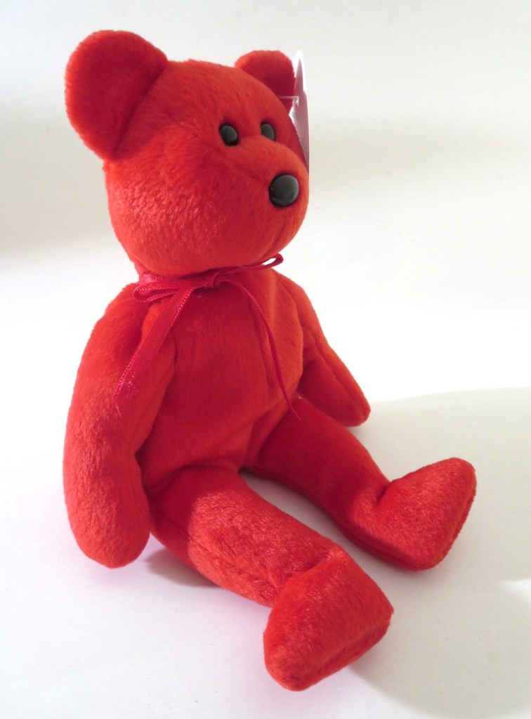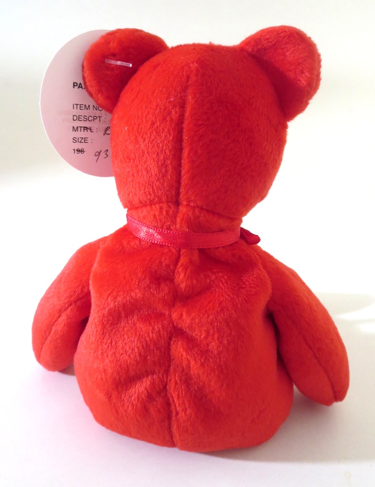 Ty wasn’t always set on his six original teddy colors- teal, magenta, violet, jade, brown, and cranberry. We have long seen Ty use a variety of his original fabric colors in his prototypes. It was believed this was also the case for his original teddies. Proof of this was first most prominently confirmed when Ty displayed six old face teddies at one of his Tyriffic Stores in unproduced colors : old face red, old face orange, old face tie-dyed (garcia colors), old face black, old face light pink, old face lavender (picture below). In this set we have that very Tyriffic Old Face RED teddy (hence no pax tags).