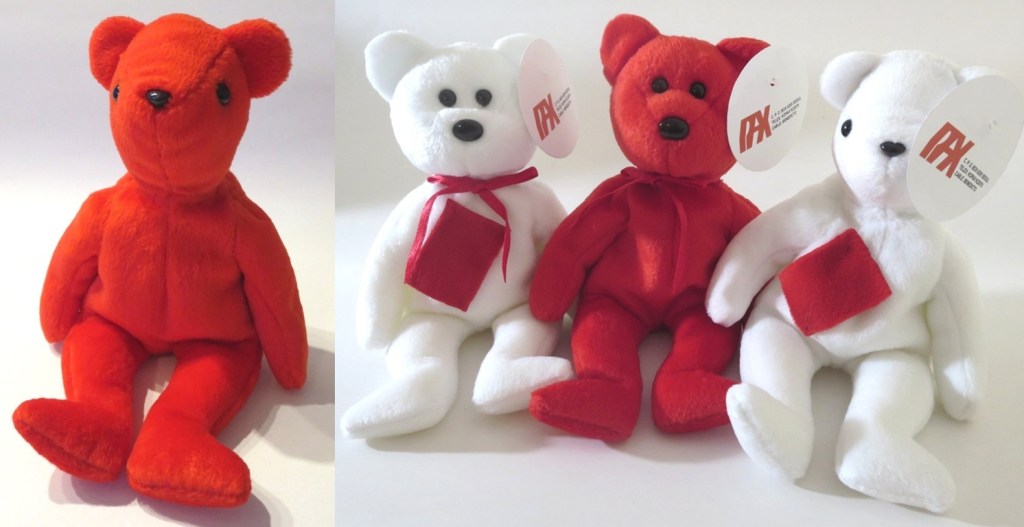 Rarity Rank: 0. All four of these pieces are easy rank 0 pieces. Full departures for original 1st and 2nd generation styles. There is an argument that these could be kicked up to a higher rarity class given they are full color alternates for the original teddy bears of the beanie collection, which are among the most collected and coveted even today. The old face bears will all have 1992 pax hang tag dates, and the new face bears will have 1993 pax dates – so their age and notoriety are beyond reproach. An entire assembled set adds an additional WOW factor, on top of everything.
