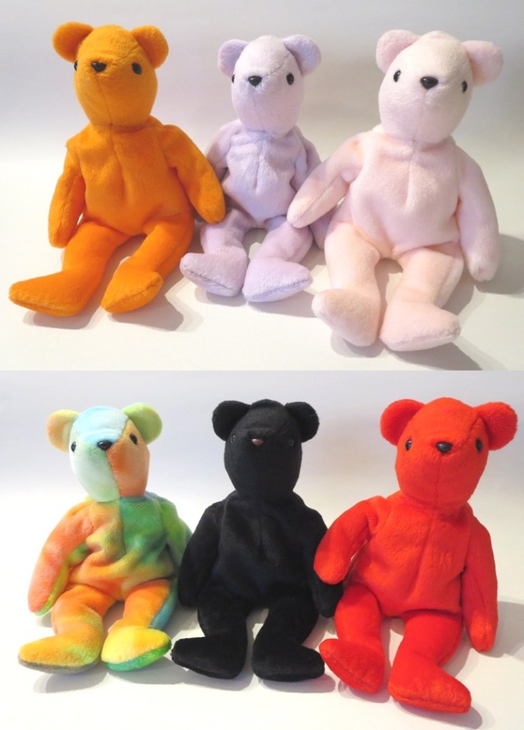 Rarity Rank: 0. All four of these pieces are easy rank 0 pieces. Full departures for original 1st and 2nd generation styles. There is an argument that these could be kicked up to a higher rarity class given they are full color alternates for the original teddy bears of the beanie collection, which are among the most collected and coveted even today. The old face bears will all have 1992 pax hang tag dates, and the new face bears will have 1993 pax dates – so their age and notoriety are beyond reproach. An entire assembled set adds an additional WOW factor, on top of everything
