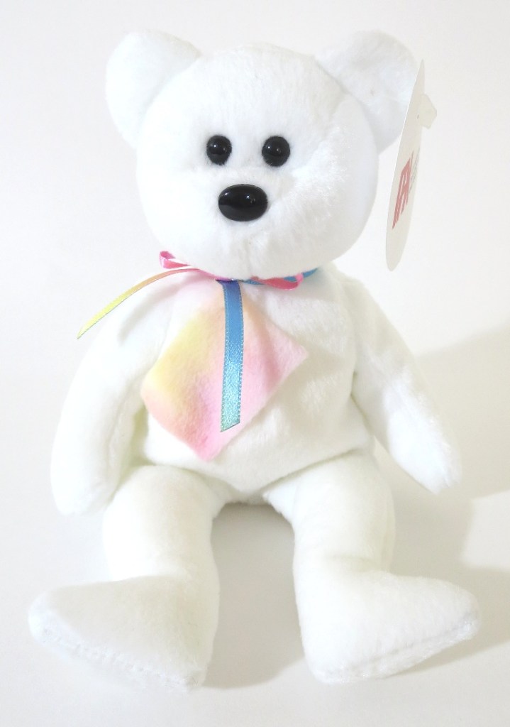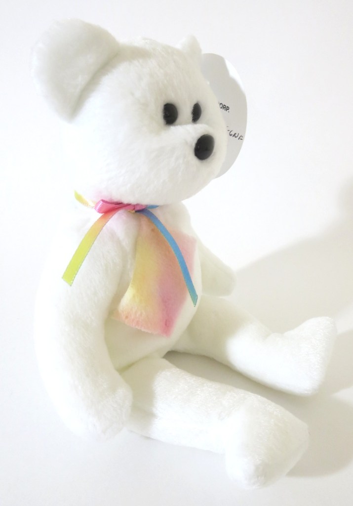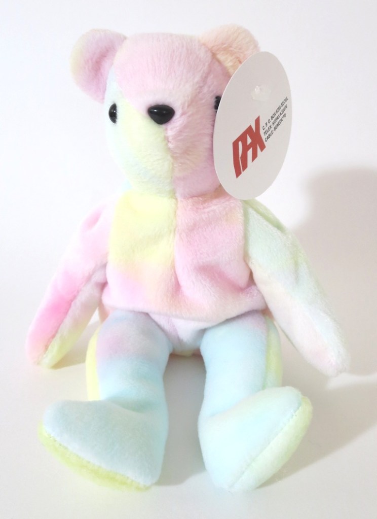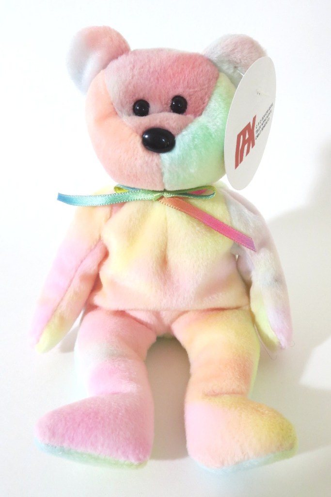 Pastel Tie-Dyed Old Face and New Face teddy set! The colors especially on the old face teddy are so stunning. We see complete pax tags on each piece in this set – easy now to see the time and progression between each bear. Ty didn’t end up using pastel tie-dyed fabric until the pastel Peace bear that we first saw in the 5th generation. To think, we might have seen it as early as the first generation OF teddy!