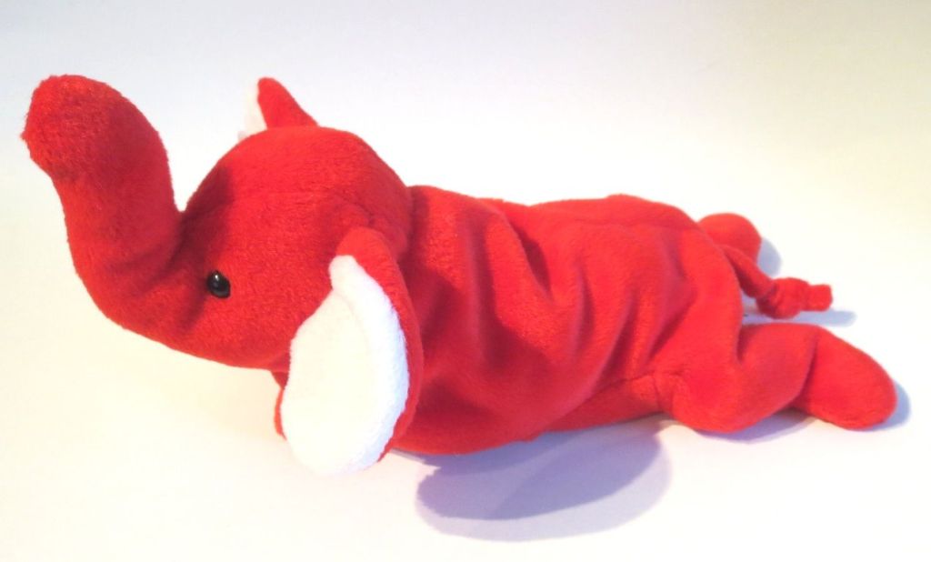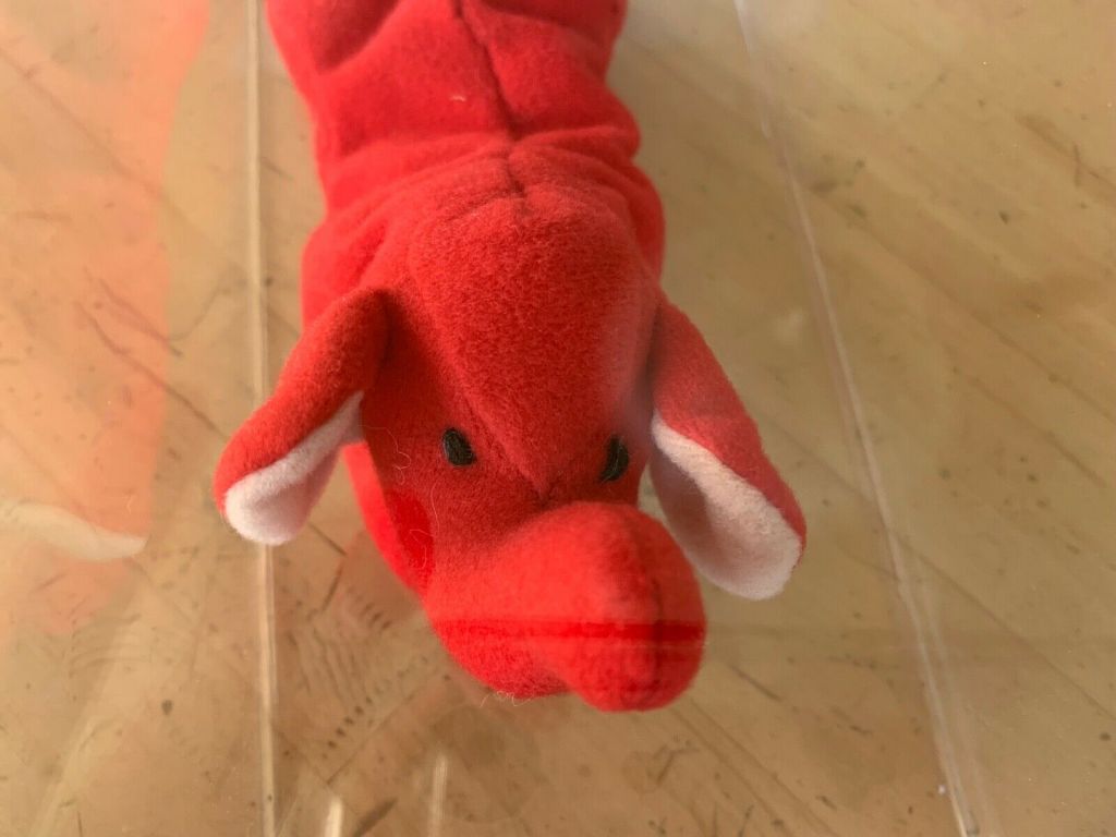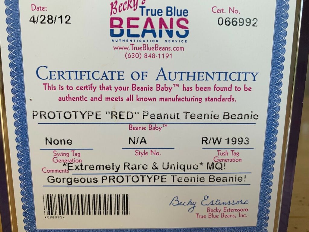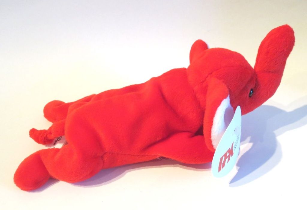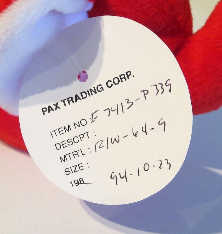 Ahh! Here is the famous red and cream prototype Peanut! This piece is a beautiful solid red with amazing white inner ears. Full pax tags, and 1994 pax date, placing this piece as still a half year ahead of the release of the original royal blue peanut. We often see a prototype teenie ty peanut in red:). Also picture below. It appears Ty really seriously considered this piece as the one to release. This piece is viewed as a bit of a counterpart to the black widow peanut prototype, reviewed a few weeks ago.