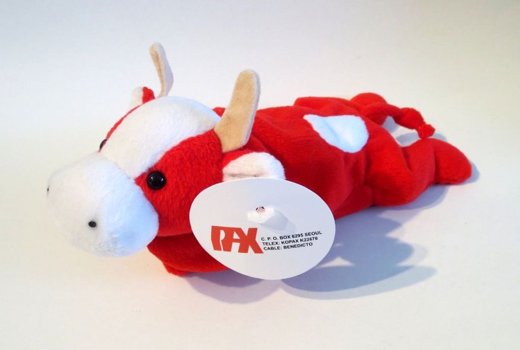 Mooooo -ve on over! A 1st generation full alternate prototype for the original cow, Daisy! This piece is the signature bright red fabric seen on the original 9 pinchers. It is complete with pax tag and tush, and early 1992 pax dates. STRIKING!