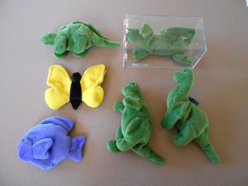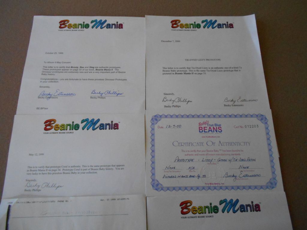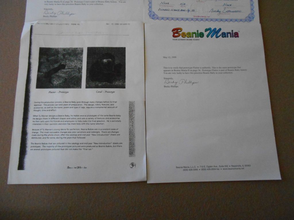 In the famous Beanie Mania books, the authors (Becky Estenssoro and Becky Philips) put forward a masterful outline of every production beanie produced to that point. They also have a special prototype section that includes six very special prototypes: a dinosaur trio (Rex, Steg, and Bronty) and the tie-dyed Lizzy in a solid Ally-green fabric, with tie-dyed patches matching the eventual production fabric that would be used. With this set, they also had pictured a solid yellow flutter (with patch) and a solid violet Coral (with patch). These pieces were some of the earliest and most prominently documented and displayed prototypes the hobby had seen. Today they remain among the most famous pieces.