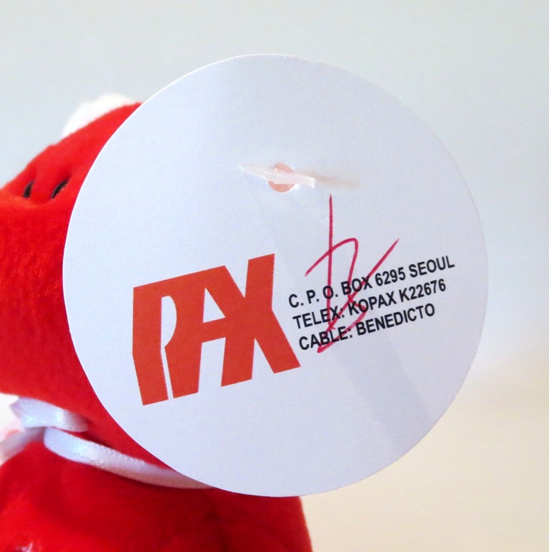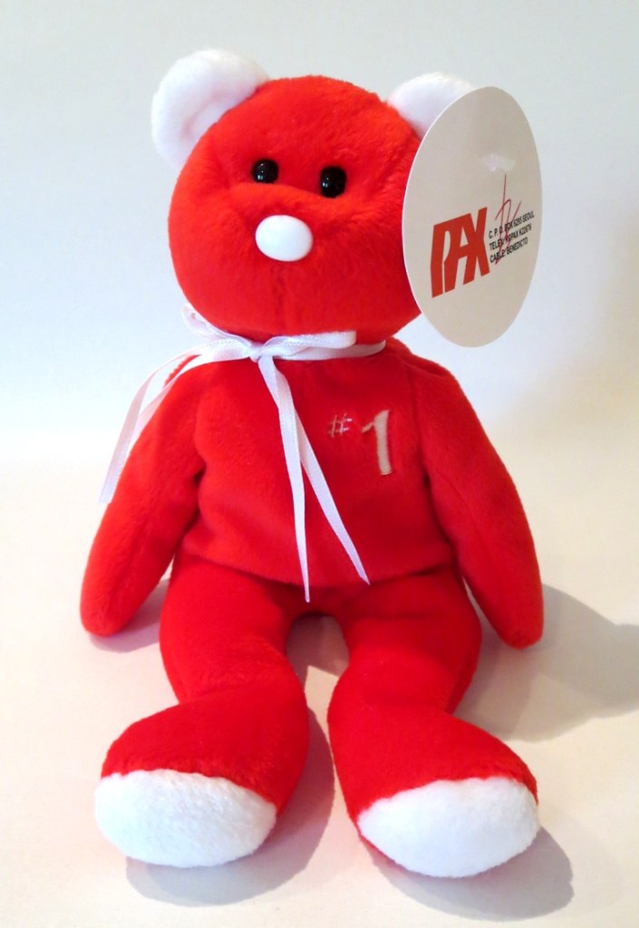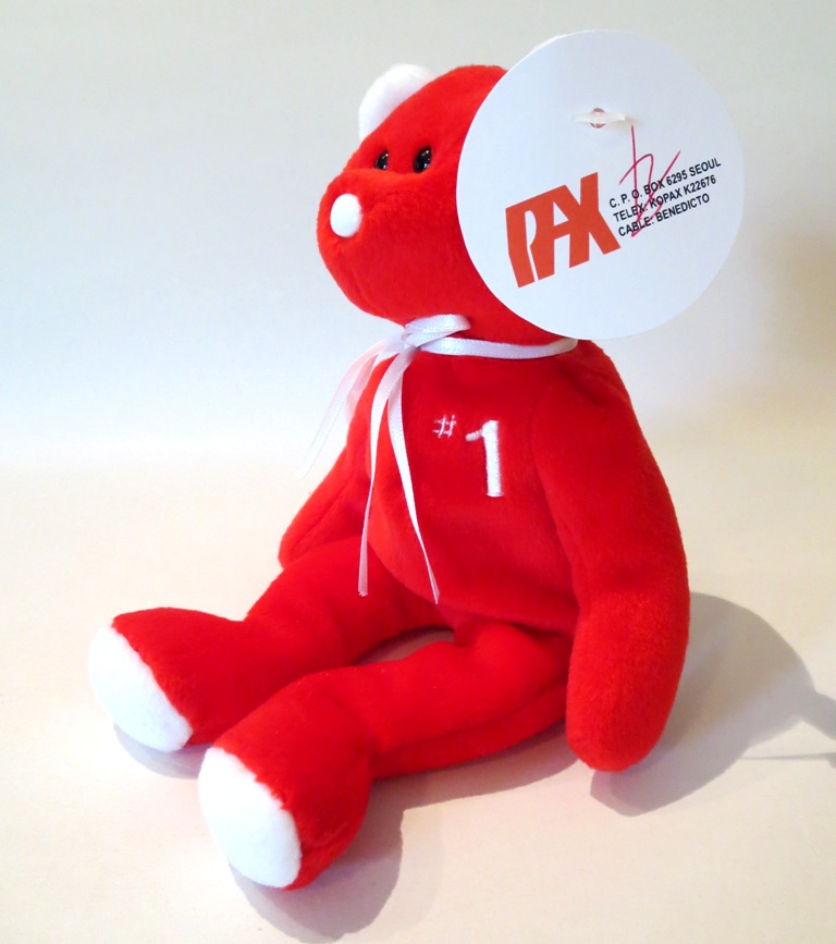 This is a very special piece indeed. The Ty #1 rep bear, discussed in several previous posts, is still to this day one of the most coveted production pieces in the hobby. With only 253 examples, and most buried in the oldest most vast collections, finding a MQ example will still take many thousands of dollars. To many, this piece is the pinnacle teddy bear in the hobby. This is a stunning prototype example with white ears, padded white feet, white ribbon, and white nose! The piece is complete with pax hang and tush tags. The pax hang tag is signed by Ty in red! August 1998 pax dates put this piece at about 4 months prior to the piece’s production release and distribution to Ty reps. Fun fact, this piece resides in the personal collection of this author. It was always a goal to secure the rarest Beanie Baby teddy prototype and the rarest Attic Treasure teddy prototype. See below – this piece seated next to one of the four created infamous Woolie Brown attic treasures – that line’s rarest teddy.