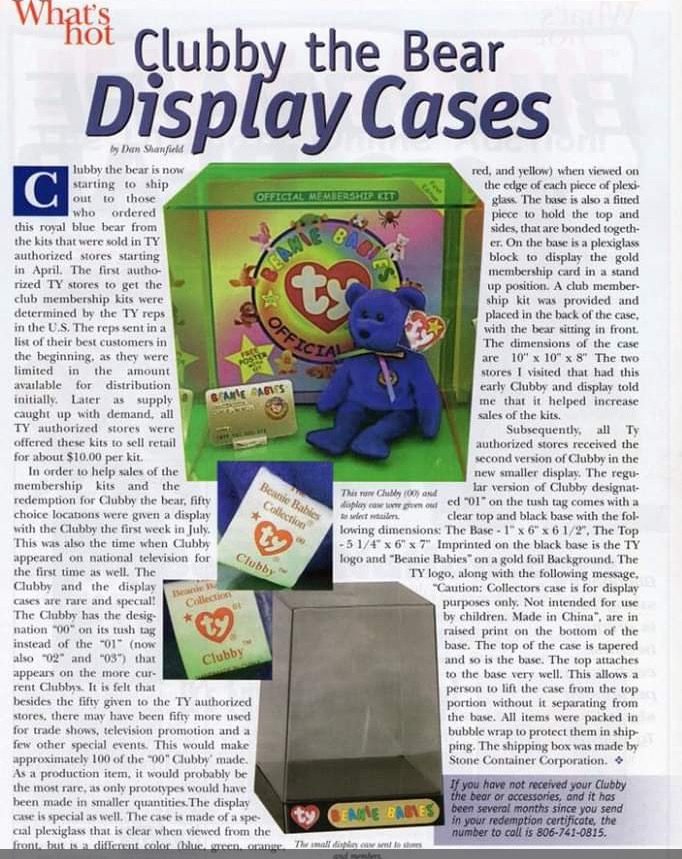 An old excerpt: ” There is a number located on the tush tag of Clubbie in the upper right side of the TY logo. The common one to see is 03. There are however 4 different numbers. The first 50 made carried 00. These were only shipped out to retailers that were hand picked by TY as what they say is the “prefered retailer”. The display case given were special too. They were a special plexiglass that was clear when viewed from the front, but tinted a different color (blue, green, orange, red, and yellow) when viewed from the edge of each piece of plexiglass. It had room to place the club kit inside, and had a holding area for the gold card, placed right beside where the bear sits. There were also a group made with the 00 on the tag used for promotional purposes and the one you saw on TV. The best current count that is known is only 100 out on the collector market. 01 showed up as the regular promo retailer’s beanie. It shipped with the regular case that everyone could order. As they were shipped to the people that ordered them, 02 was what was reported on the tush tag. Currently the number reported is 03. These are designation numbers of the lots they were shipped. It isn’t seen yet in the market which is the most valuable, but we’d have to say the one the value follows the lot number. 00 being the most valuable, down to 03 the least.”