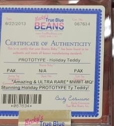 Rarity Rank: 1.5-1.75. This is an entirely unproduced prototype teddy with very old 1994 pax tags. What sets it apart is that it represents the precursor to what would eventually become the holiday teddy line that would carry on from 1997-2008!