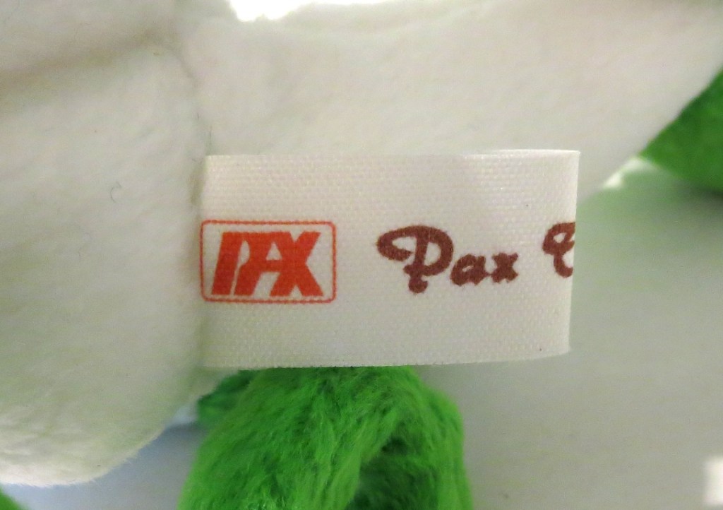 We have almost completed the prototype Nana tour! We promise – only 1-2 more;). But again, this style was Mr. Warner’s favorite, and it appears he issued it to test out a number of fabric color variations – even if he had no intention of releasing Nana in said shades, he still wanted to see how the combination might contrast. Here we have an exquisite solid WHITE nana with Legs green face and extremities. This is the only known Nana prototype to have a solid white body, and the only piece to have green extremities! The piece is complete with perfect pax tags – mint pax hang tag with 1993 pax dates!