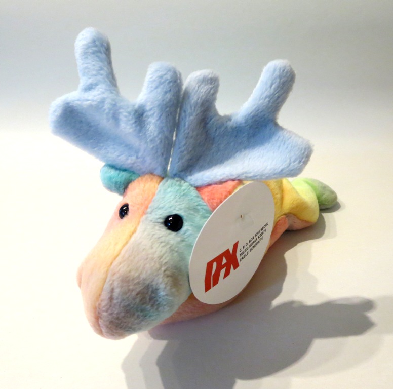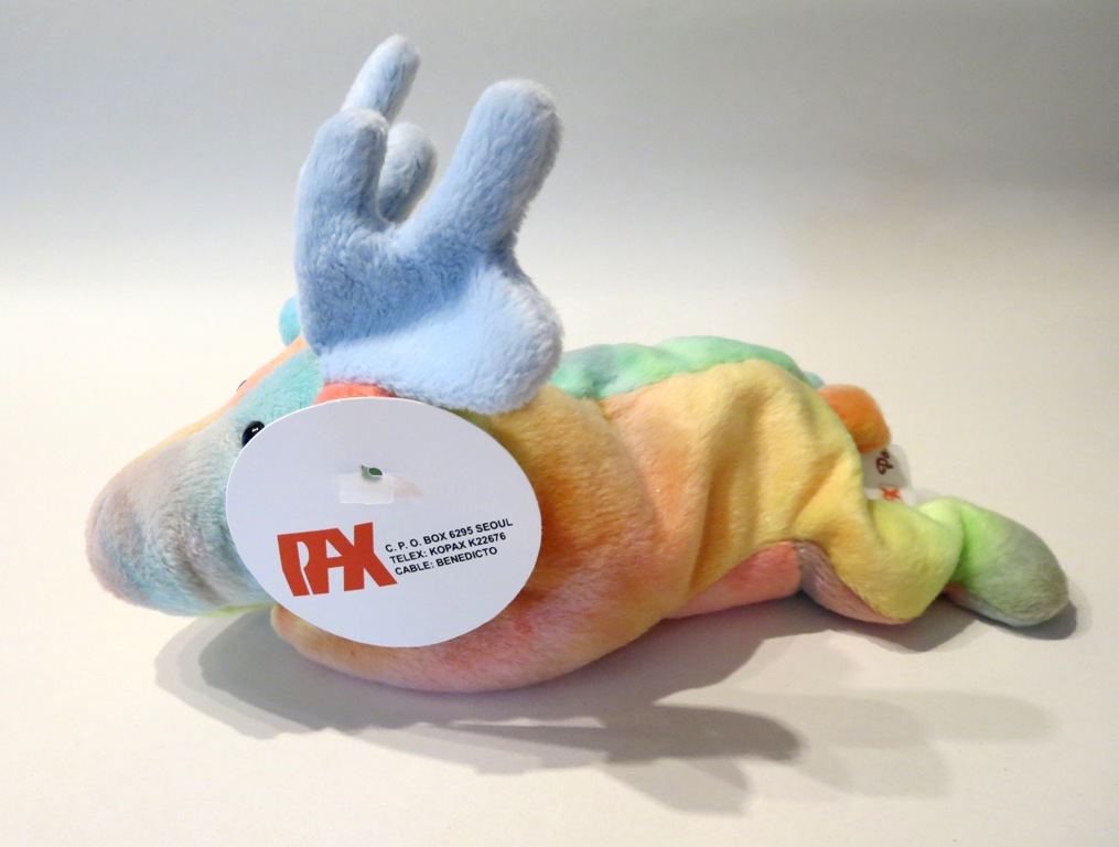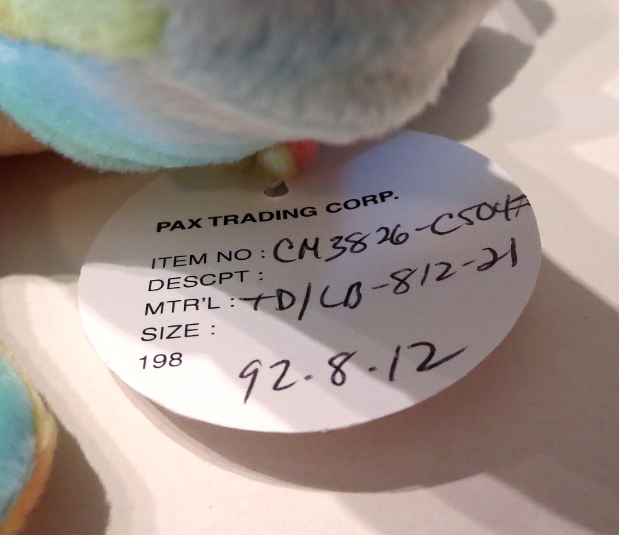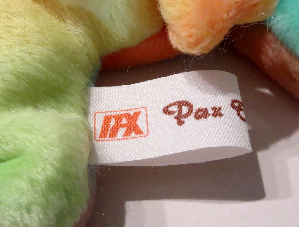 This is one of our all-time favorite prototypes – a (the!) tie-dyed Original 9 Chocolate the moose! This piece has it all – a WILD departure from an iconic original 9 piece – fully tie-dyed body, light blue fabric for his antlers, complete pax hang tag and tush tag – complete with an original 1992 pax date…a superb piece! We have a theory that Ty created a tie-dyed version for all of his 1st generation pieces. While unfortunately this was never confirmed, a few of his original tie-dyed prototypes did in fact survive. This is one of them. And this guy is fantastic! It was the (still MIA) Tyriffic Legs the frog and the Tyriffic tie-dyed old face teddy that put the tie-dyed theory out there.