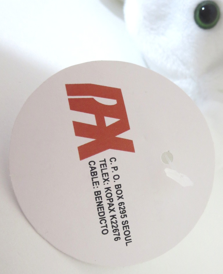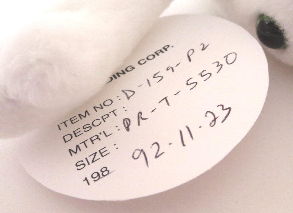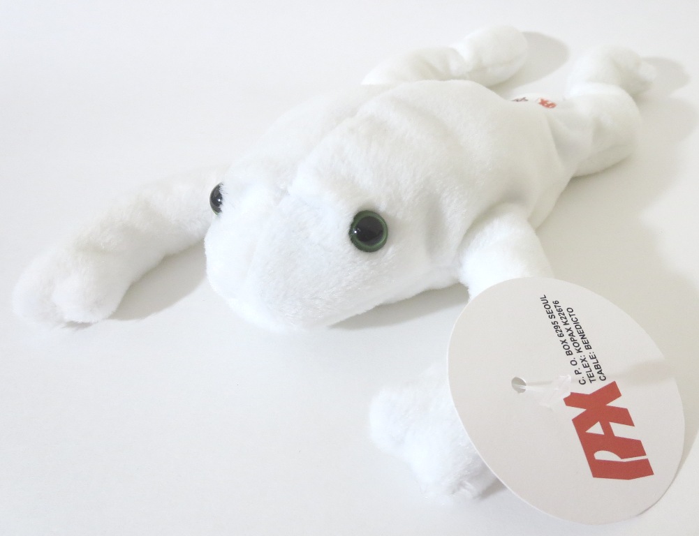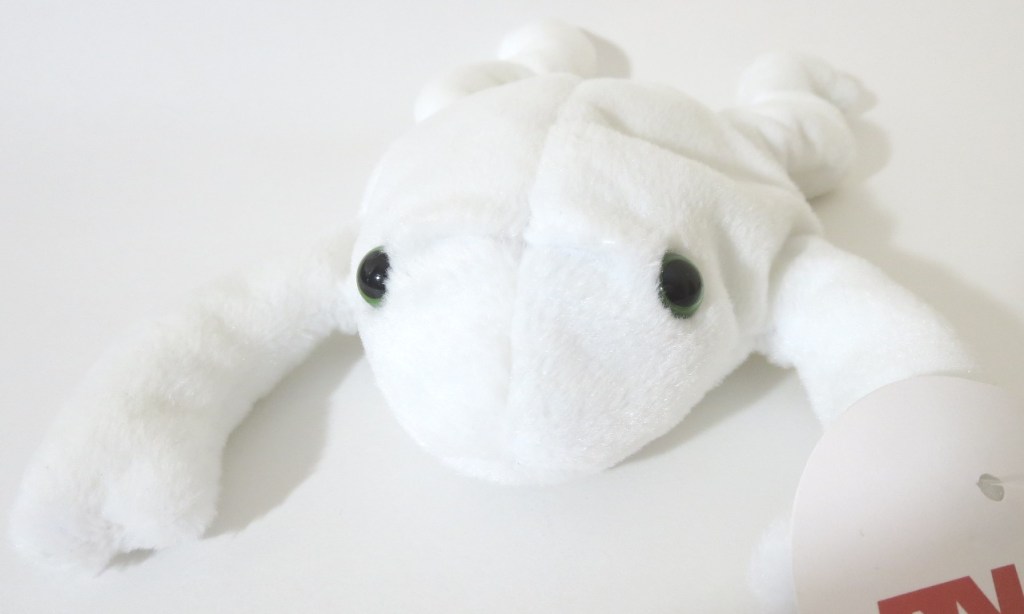 Here is a genuine original 9 prototype for Legs the frog! The production Legs came in solid lime green. This example is completely white! His eyes do appear to match the production Legs’ eyes (black pupils, lime green rims). This Legs is complete with pax tush tag and pax hang tag. Pax dates are from 1992 – dates that put this Legs squarely in the original 9 1st generation date range. Interestingly, there are a few Legs prototypes we have seen – a famous tie-dyed Tyriffic example that has yet to surface, and a solid colored set of examples with very strange production tush tags. but this is the only known and verified full color departure example.