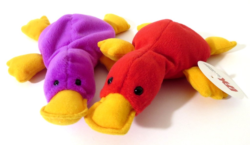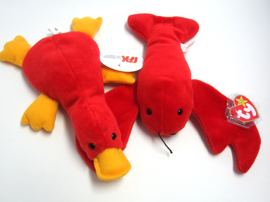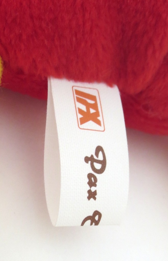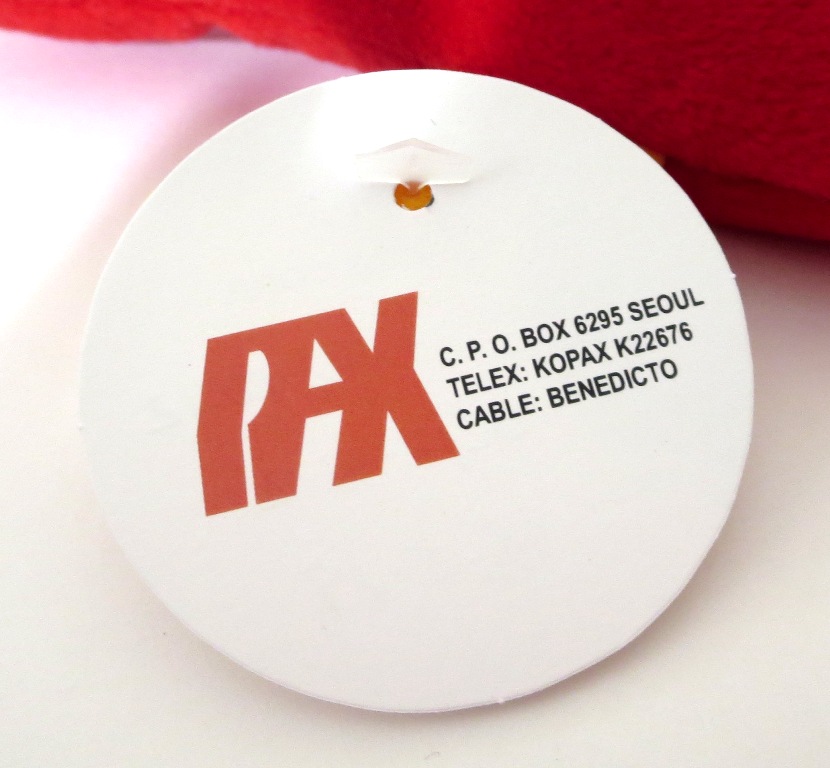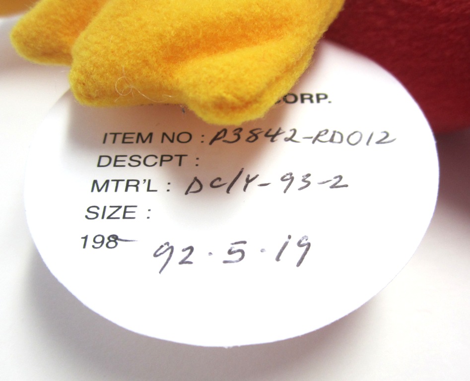 Patti the Platypus, now affectionately known as one of the “original 2” styles, is one of the most intriguing pieces in the hobby. Early on graders aligned and categorized Patti’s many shades into four distinct colors – deep fuchsia (1st gen), raspberry (1st and 2nd gen), maroon/magenta (3rd gen), and fuchsia (3rd gen onward). But in truth, there were many micro color variations that were lumped into these categories: deep raspberry, champagne – it is why we absolutely love that a Patti prototype exists with SOLID RED fabric. This piece is complete with original pax tush tag and hang tag, and exceedingly early May 1992 pax tag dates. This piece is entirely red, outside of her bill/webbed feet. You can see this piece next to the red fabric of a production pinchers, and next to a number of other production patti color variations (including a partner prototype that will be reviewed shortly).