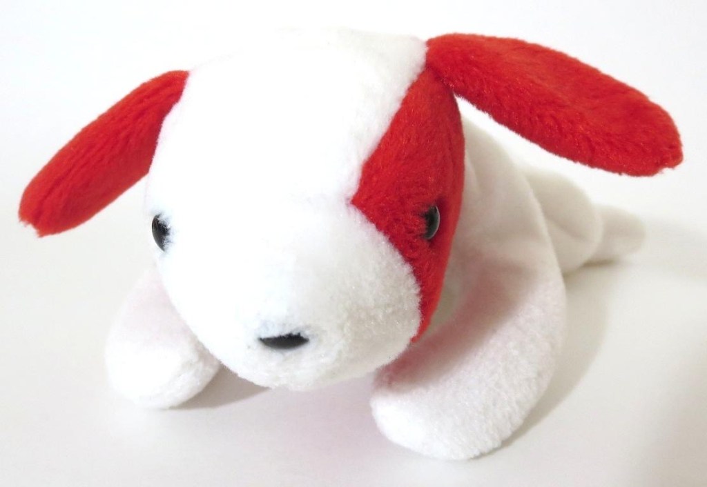 Spot – Red eye patch, ears, and tail! Production white fabric. This is similar to the brown and white Spot we will be reviewing shortly. Very vivid!