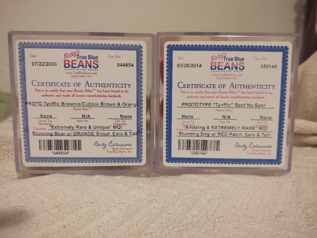 Quite a few of her pieces were moved privately, and directly by 1-2 reputable dealers, so provenance can be traced back to their original source – how the “Tyriffic” status is certain, even if no picture proof exists of many of these pieces on display at the Tyriffic stores. While over the years, we have seen signature Faith pieces – lime green Slither, yellow Nana, etc. – the original 9 prototype set had been MIA for quite sometime, though the pieces were among the earliest graded prototypes with grades dated as far back as 2003 (predating the original proto-gate) – see below for authentication certification pictures. The collector who purchased the set (pictures below) eventually sold them and split up the set. We are going to review these pieces individually below, but none have pax tags (lines up with Faith/Tyriffic pieces), and this set is similar to one other original 9 prototype set that has survived/was saved by a senior Ty executive.