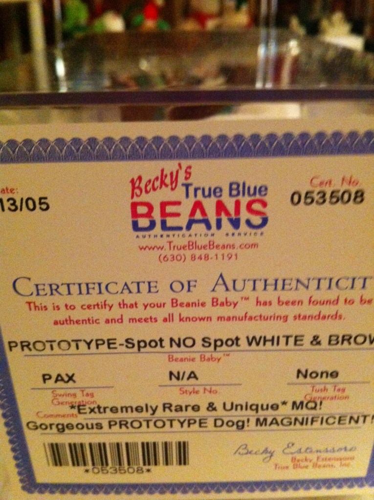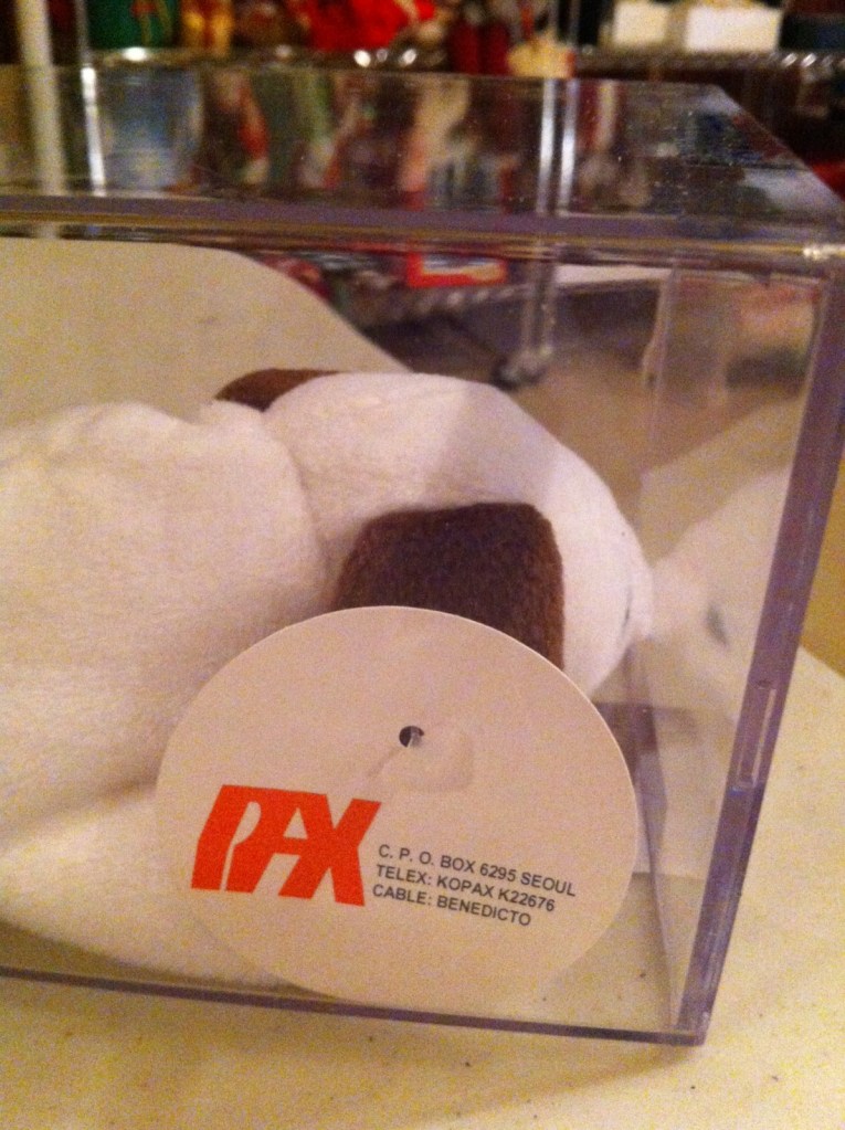 This is an original 9 prototype for the original Spot no spot the dog. He has chocolate brown Cubbie/Brownie shaded fabric for his ears, eye patch, and tail! This piece is complete with pax tags, and has an extremely early June 1992 pax date – there are very few prototypes with dates this early. This Spot is magnificent and has a parallel twin in red part of the Original 9 “Faith” set. In fact, this additional parallel original 9 set, we will call the “Design” set. We will outline that entire set in a single post, next. But this piece was separated from that original set, but eventually was reunited!