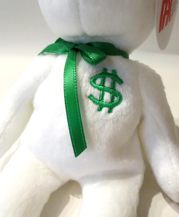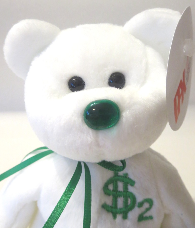 These two bears are extraordinary. While our site hasn’t delved too deeply into the Billionaire prototypes that exist, we wanted to do a 2-in-1 post about two very special Billionaire prototype examples. A couple of examples per Billionaire were created specifically as a set as special gifts for Ty Executives. Others were the true origin designs/ideas for the bears as Ty began to craft his designs. The two bears below are the confirmed original prototype designs for the Billionaire 1 and Billionaire 2 bears. The Billionaire 1 prototype has 3/18/98 pax dates. The production example was released to employees 9/26/98. The other surviving prototype bears were created in July of 1998 – months after this example. All much more closely resemble the final production bear. It is confirmed this is the earliest prototype example, and is easily the greatest departure with the earliest design concept. The bear is in solid white, with money green ribbon (thick) and dollar sign. Complete with pax tags and signed by Ty in red. The Billionaire 2 prototype is similar – signed by Ty, solid white, green thin ribbon, and a green dollar sign with the #2. Appears Ty wasn’t ready to abandon this design, or used it again as a starting point. Interestingly, the production Billionaire 2 bear had two dollar signs without number. We did not see a number appear on chest (in similar fashion as this prototype) until Billionaire #4. The pax tag is also signed by Ty in red, and dated 4/22/99 – all other Billy 2 protos have 7/99 pax dates. Complete with crystal green nose.