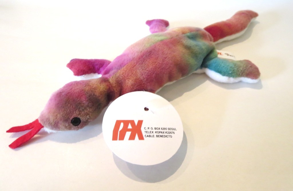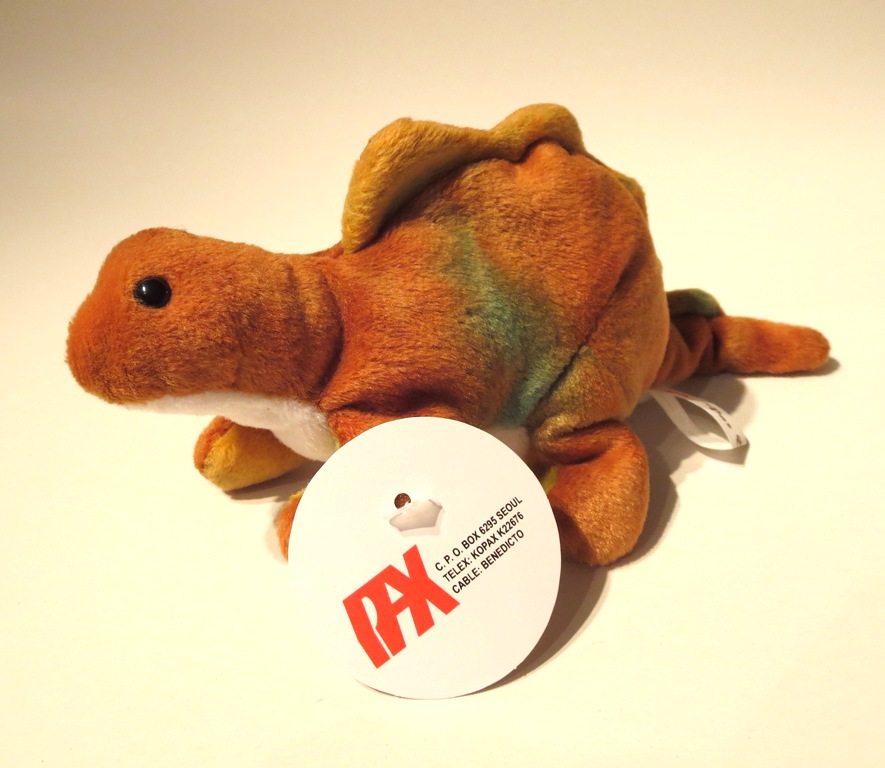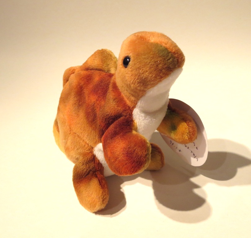 These are very fun prototypes for Bronty, Steg, Rex, and tie-dyed Lizzy. All are complete with pax tags, and have WHITE bellies/undersides. Early pax dates from January 1994 ahead of their June 1995 release. This would mean that Ty had these particular designs pretty ironed out, or at least had these as strong options, 18 months before retail release.