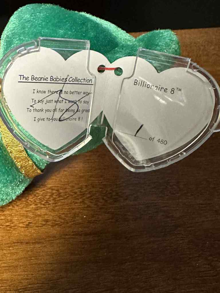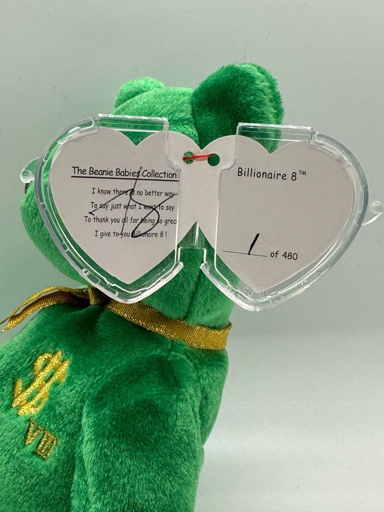 There is only one #1 Billionaire #8 bear. To rehash from other #1’s in a series – this is another one of those priceless pieces. Another piece that falls into the camp of “a collector will do whatever it takes to secure” if the opportunity ever arises. There is a fervor around the #1’s in a series – always originally rumored to be owned and kept by Mr. Warner himself. Almost every example to surface and exit into the collecting community came with fierce litigation from Ty’s end. To date, this is only the 3rd or 4th #1 Billionaire bear to surface. We have outlined the #1 Billionaire 2 and #1 Billionaire 6 on other posts. Such a treat.