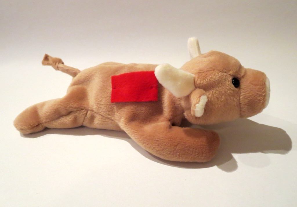 Another extremely special prototype. This is a full departure for Tabasco the bull – in solid tan with red patch! Full pax tags with pax date: 12.26.94. Production example of this piece was released in solid red on 2/3/95. There is one other know prototype for Tabasco – the famous tie-dyed example, that was reported on in another article, but this is the only known example with hang with dates. This piece was a favorite of ours and resided in our personal collection for over a decade. Finding a full alternate piece for an early generation piece is a remarkable challenge. Ty also made it a habit of releasing full alternate styles with patches of fabric color he might have been considering. Finding an example with the actual patch of color he ended up using is so cool!