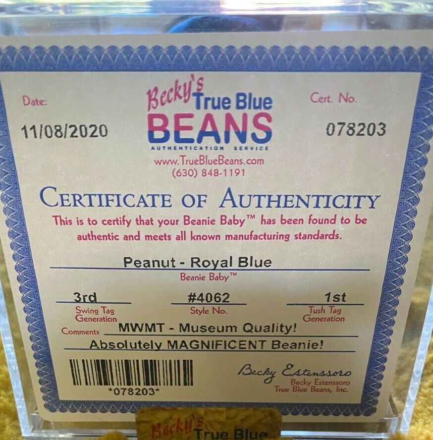 The (US) Royal Blue Peanut. Ironically, Ty did make thousands of this piece. Perhaps far fewer have survived in mint condition, but this piece, while rare, is certainly dwarfed by other items. This is typically the North Star rarity for intermediate collectors. In the wider Ty rarity world, there are many pieces MUCH more scarce, but with less demand.